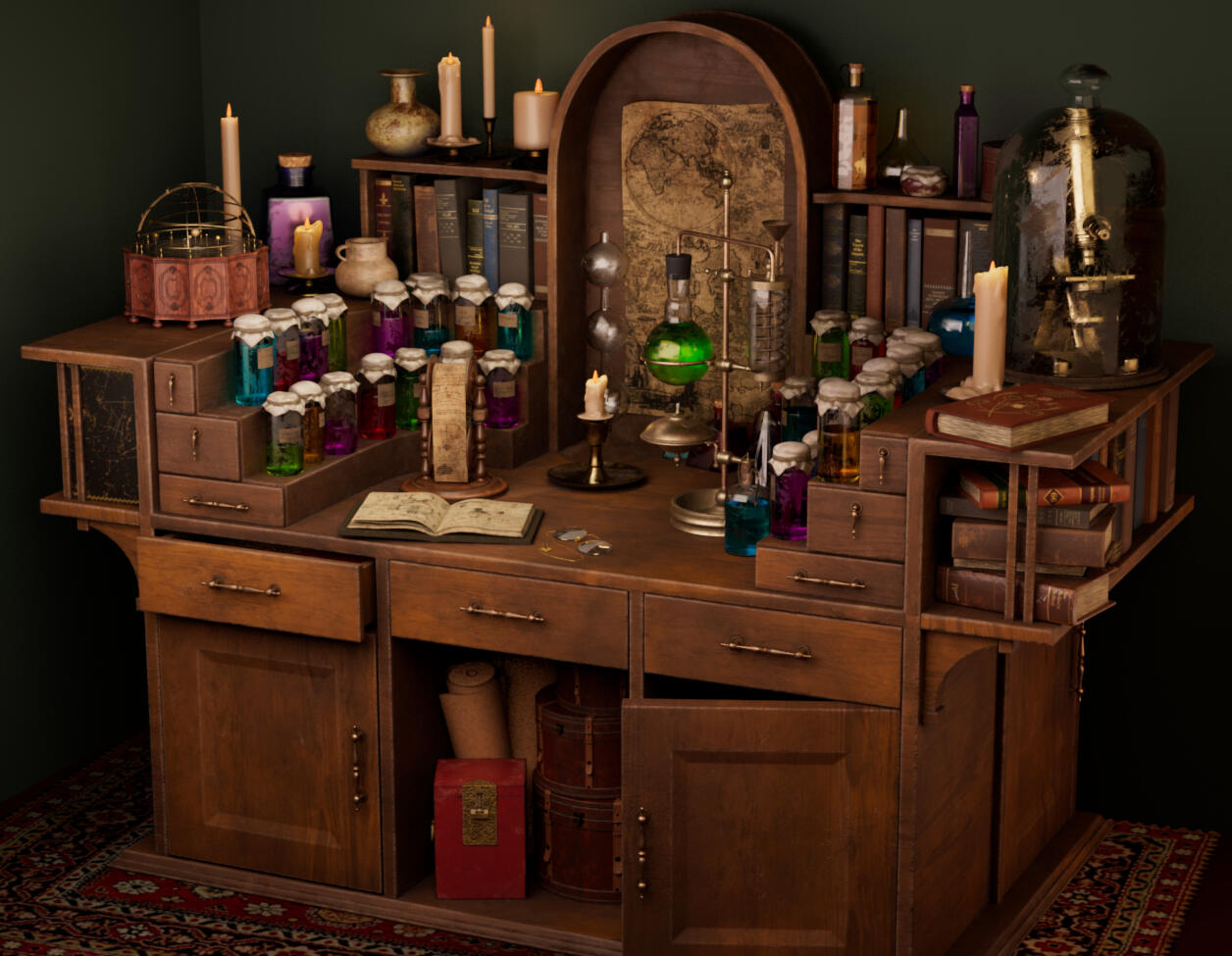 An atmospheric alchemist’s workspace built from scratch entirely by me — from reference gathering and scene composition to modeling, UVs, texturing, and lighting.